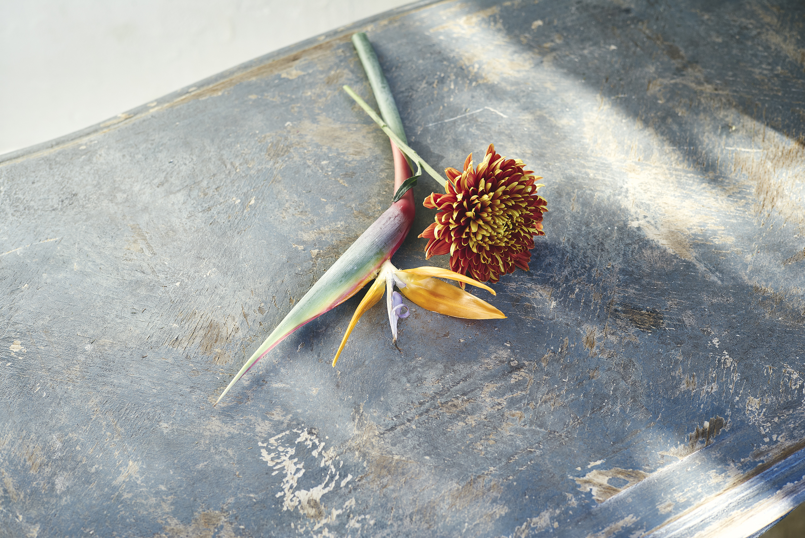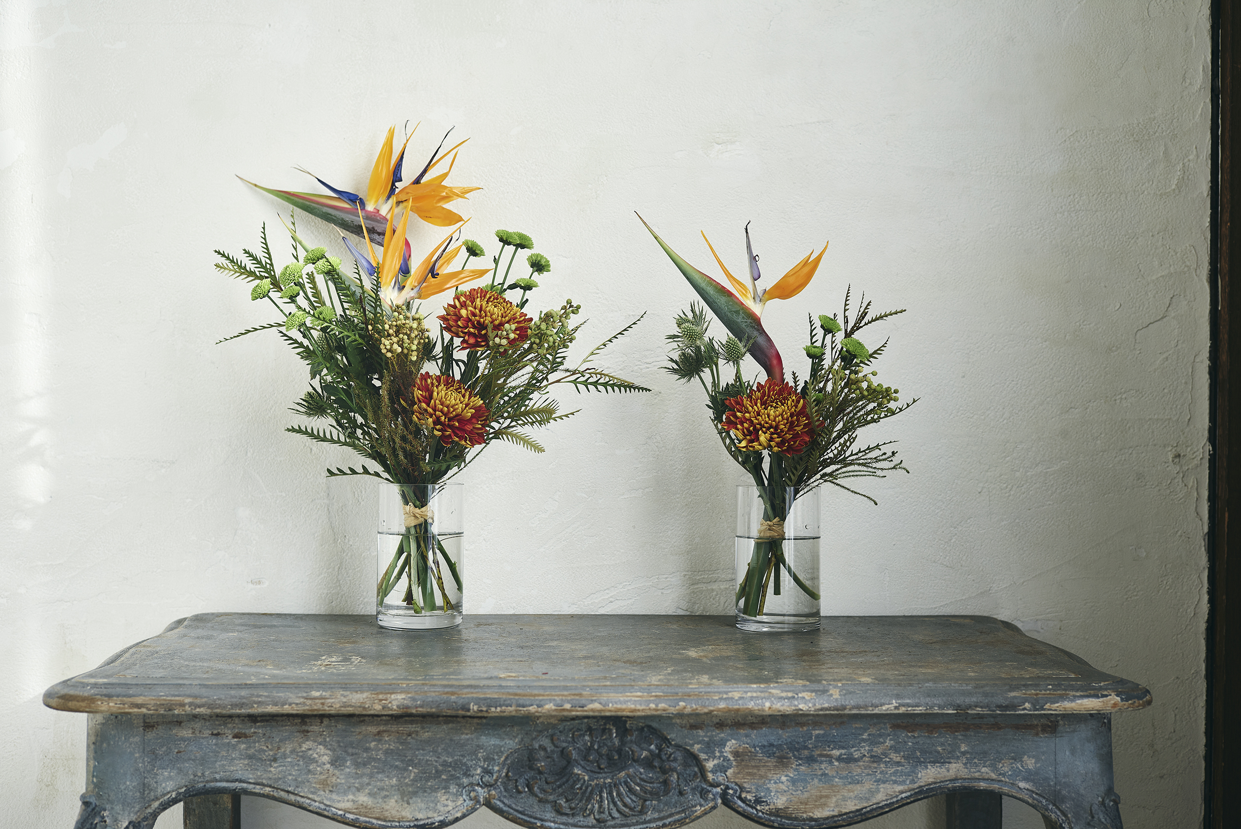 「極楽鳥花」とも呼ばれる、南国の鳥のような形と色をしたストレリチアが印象的な花束です。ストレリチアのオレンジと合う赤みがかったオレンジマムを合わせて、華やかに。グリーンやネイティブ系の花材をしっかりと入れて、F. [éf]らしくユニセックスに仕上げました。