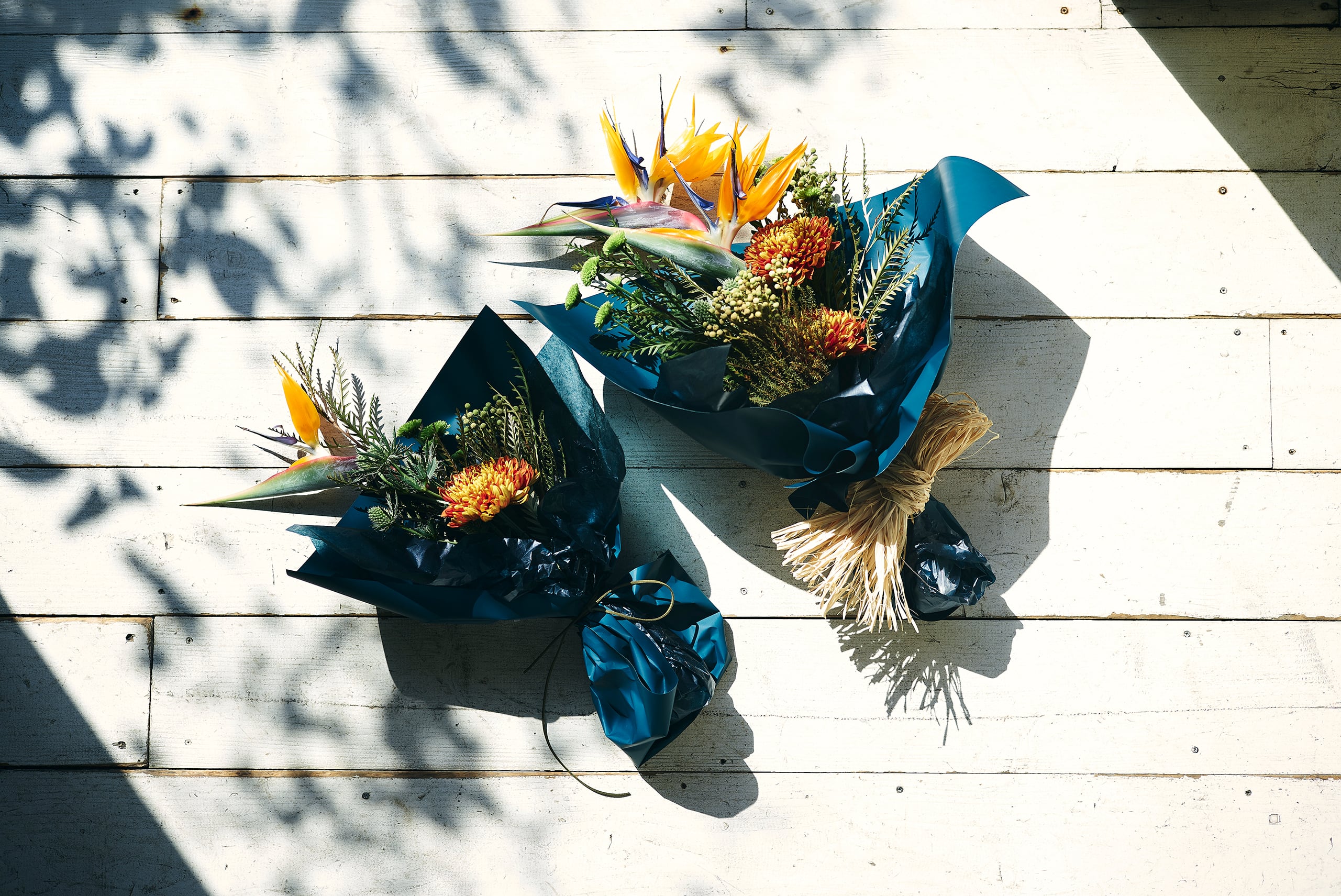 ラッピングには、メイン花材のオレンジ、レッドオレンジと補色のブルー系のラッピングをチョイスし、ハーモニがありつつもより鮮やかな印象に仕上げています。