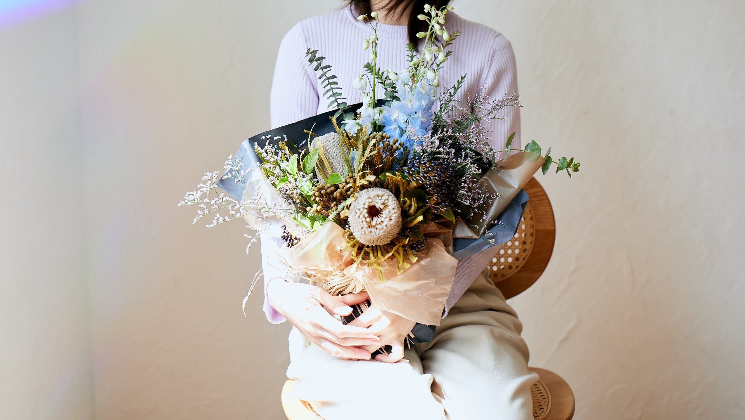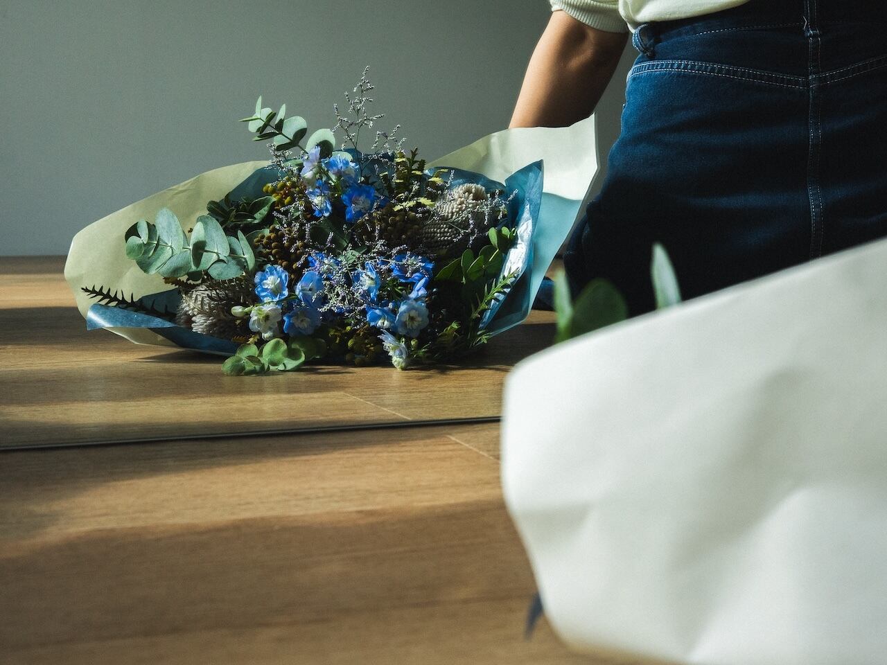 ラッピングは、深みのあるブルーとベージュを基調にまとめ、花材の色合いを引き立てつつ落ち着きのある雰囲気に。