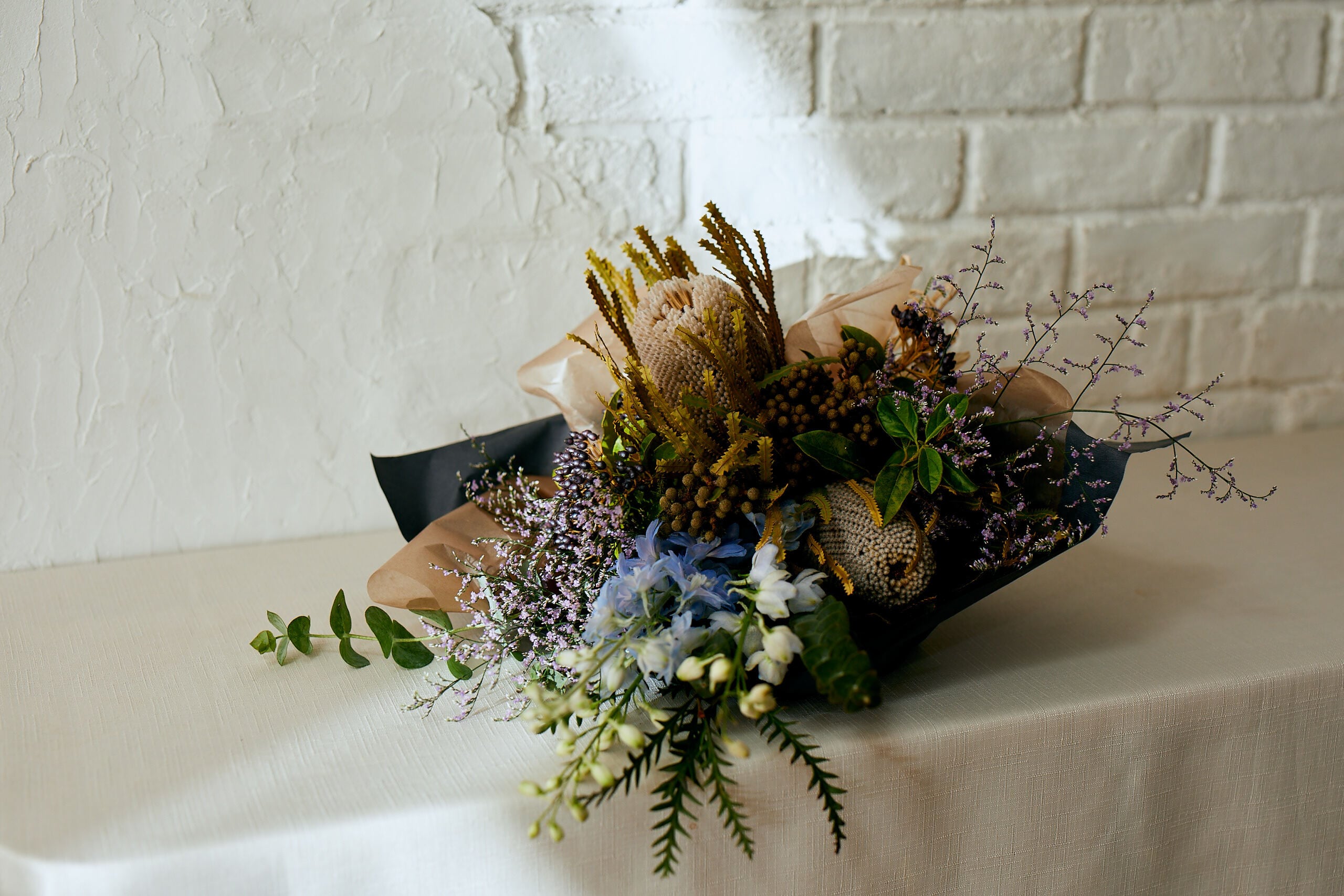 メインには、個性的なフォルムと質感をもつバンクシアと透明感のあるブルーのデルフィニウムを合わせた、季節の花束です。