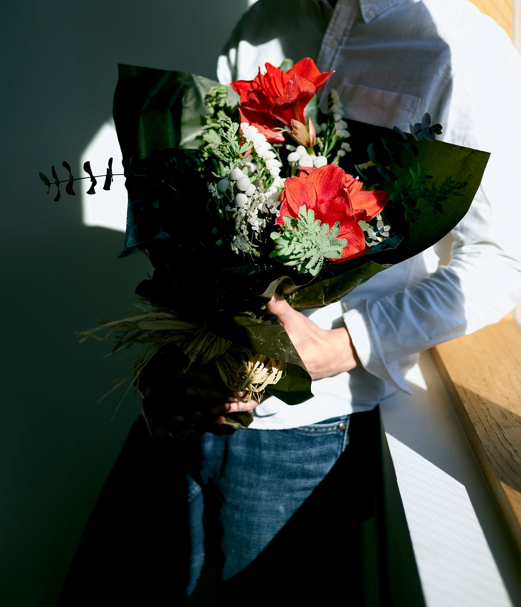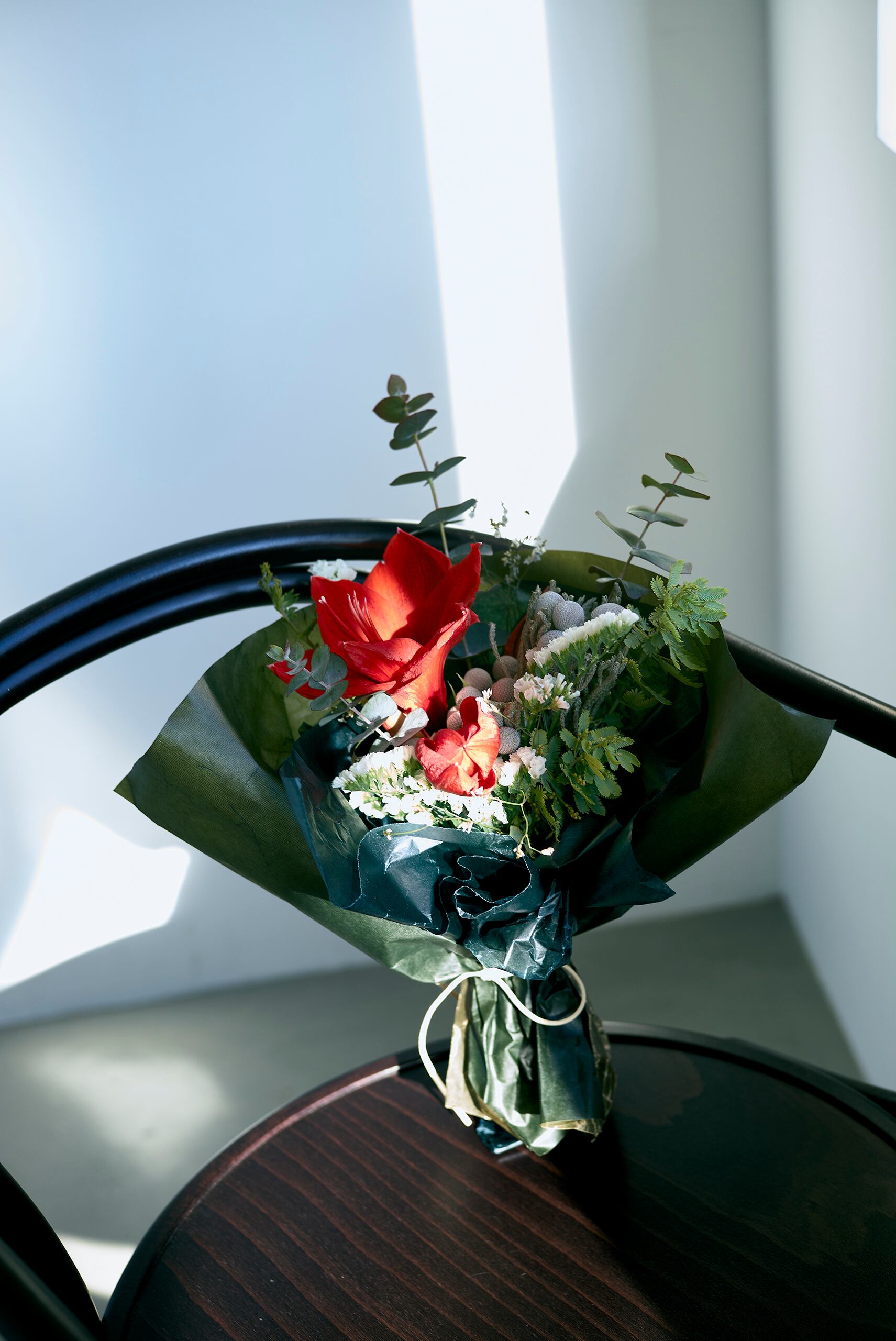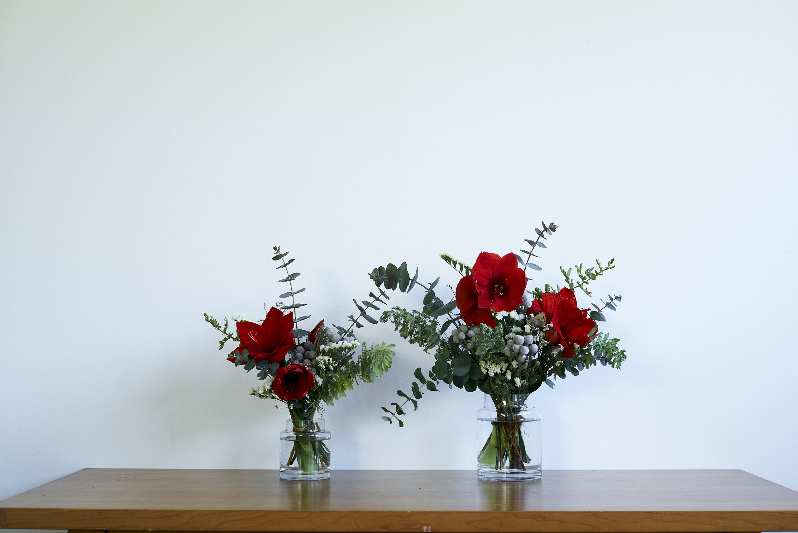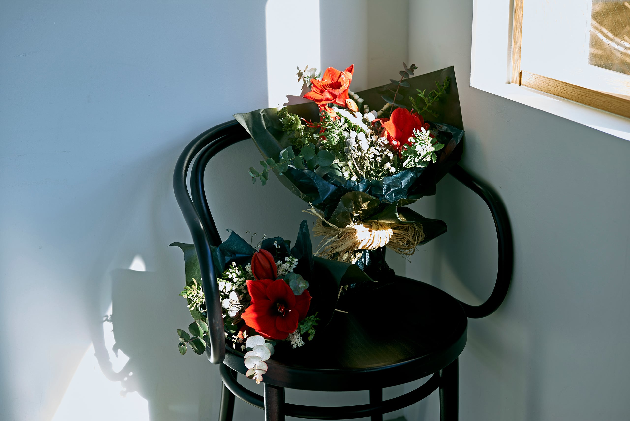 深紅のアマリリスを中心に、冬の光を思わせるシルバーブロニアを合わせた季節限定のクリスマスブーケです。