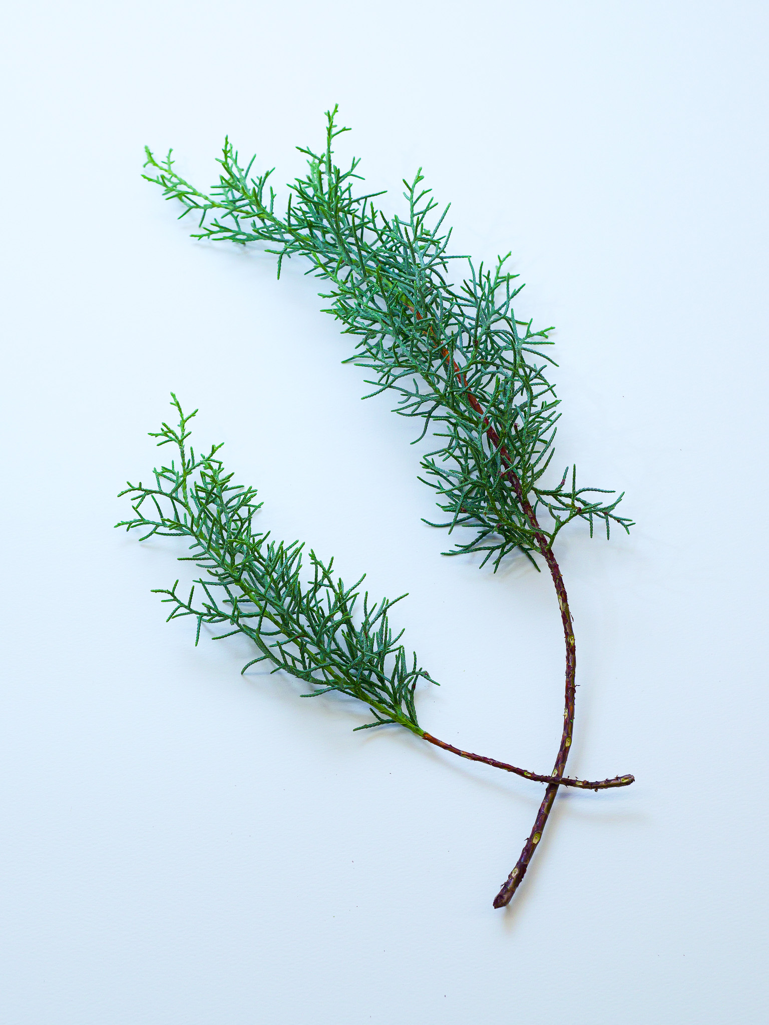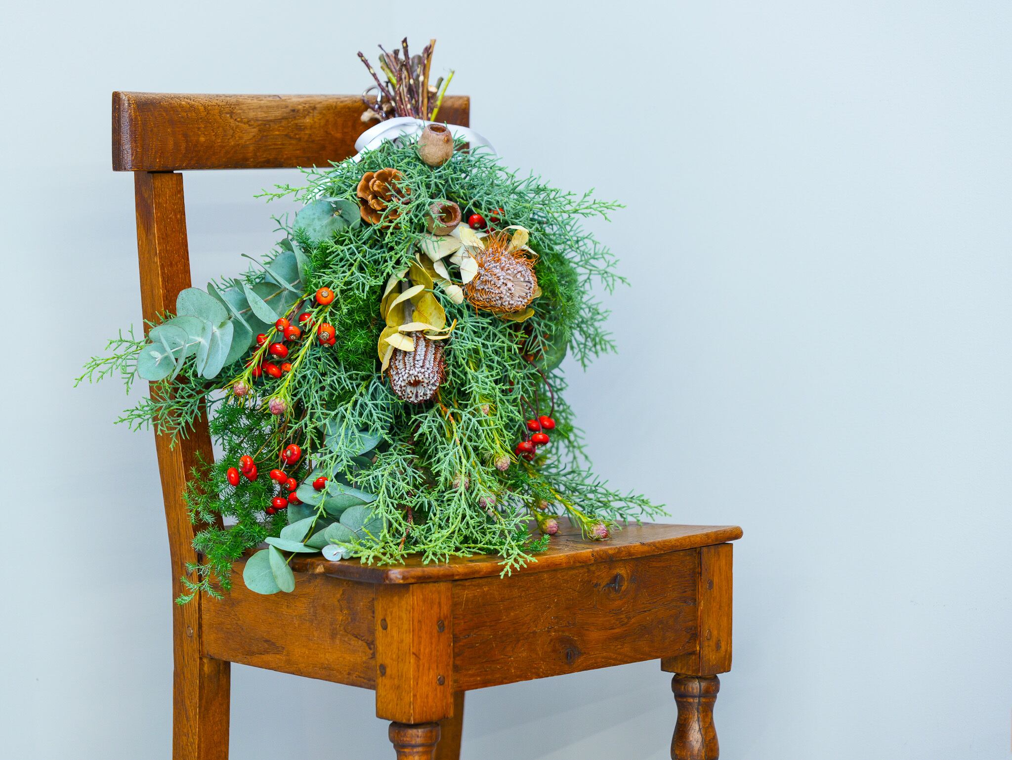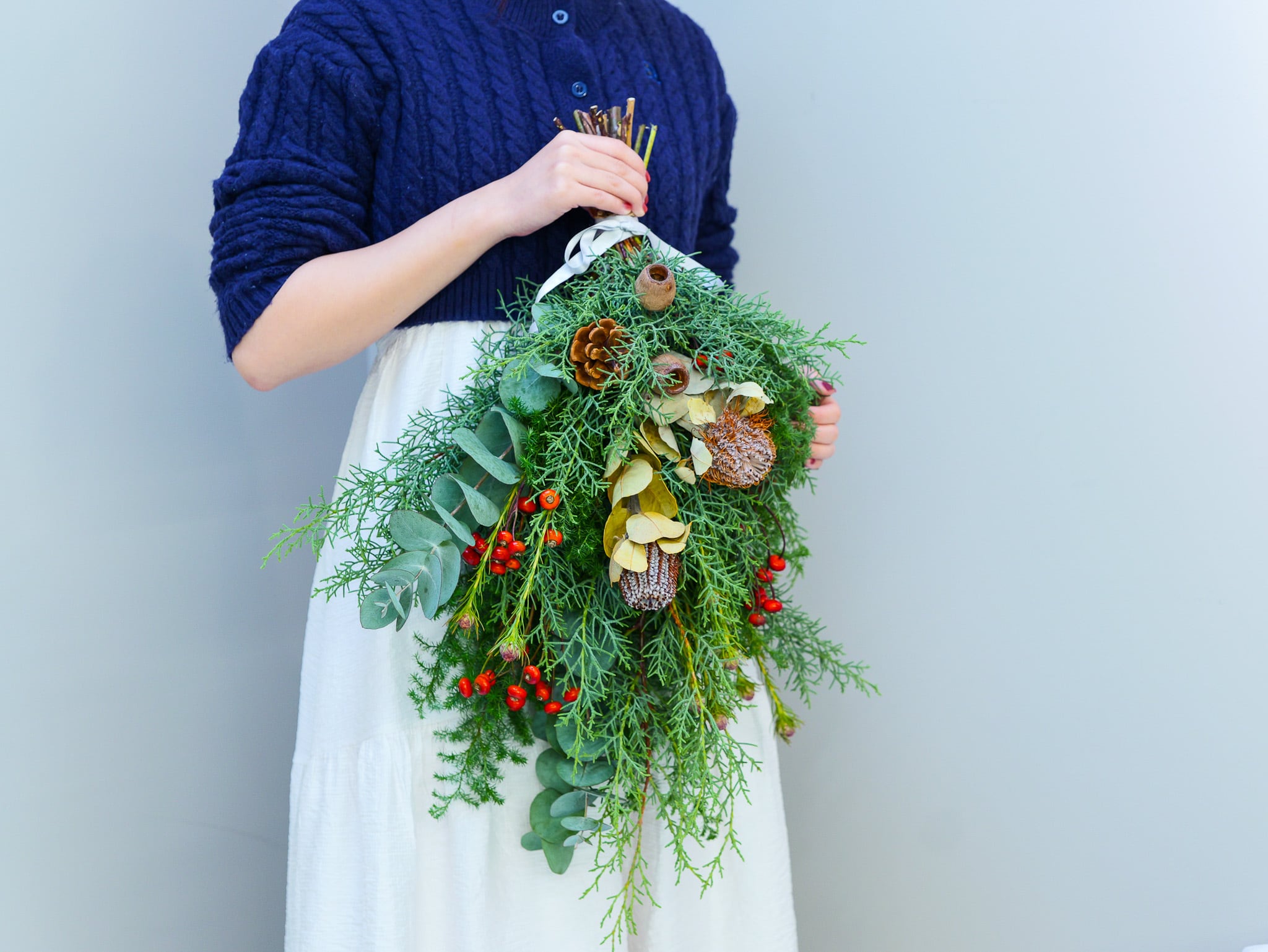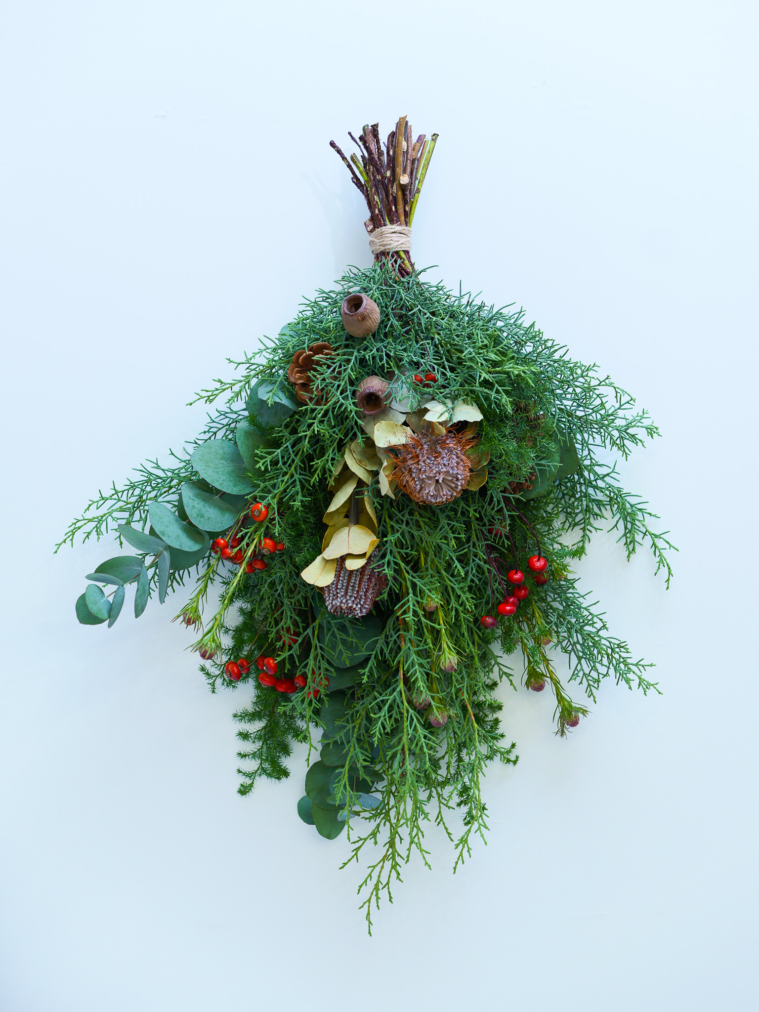 メインには、シルバーブルーが美しいブルーアイスと瑞々しいユーカリを使用しました。爽やかで清らかな印象を与えるこの2つのグリーンが織りなすバランスは、どんなインテリアにも馴染みやすく、季節感を引き立てます。アクセントには、冬の自然を思わせるヒムロスギなどの針葉樹や赤い実、そして温かみのある松ぼっくりを取り入れ、クリスマスらしいカラーリングでありながら、ユニセックスでモダンなデザインは、飾る場所を選ばず、幅広い方に喜ばれるスワッグです。このスワッグの魅力は、完成した状態でも美しいのはもちろん、自分らしいアレンジが楽しめる点です。