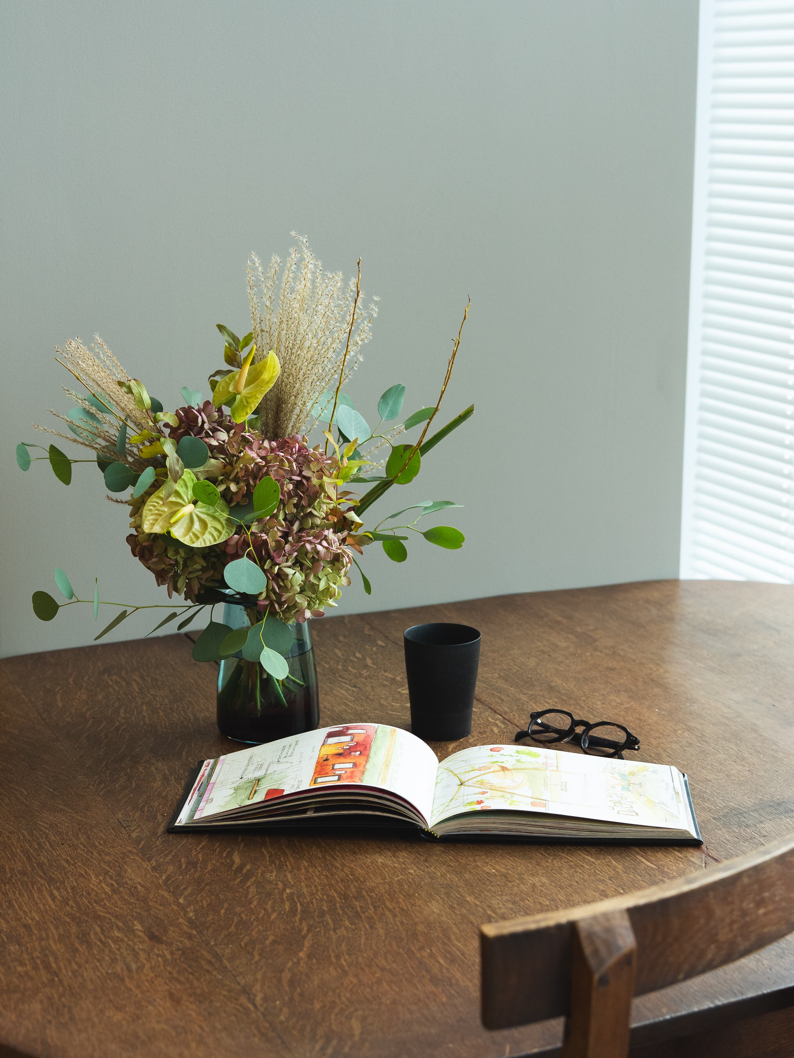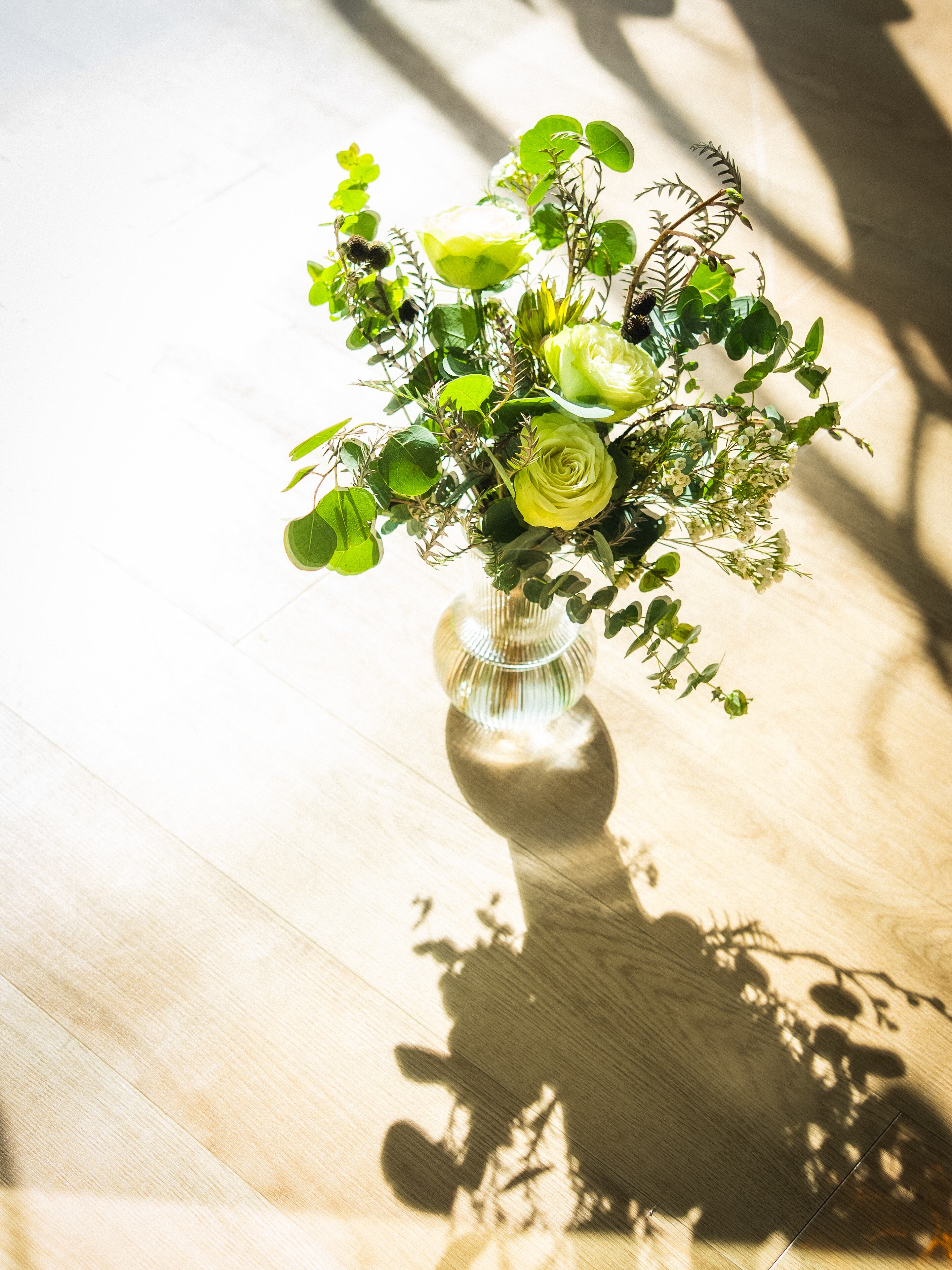 入れるべきお水の量が一目でわかり、お水を替えた日をメモしておけて、必要なお手入れが書いてあるから忘れない。それでいて、口が大きく無色透明なガラスだから、たくさんのお花を入れるのにも、一輪を飾るのにも、どんな色のお花にも、合わせられる。