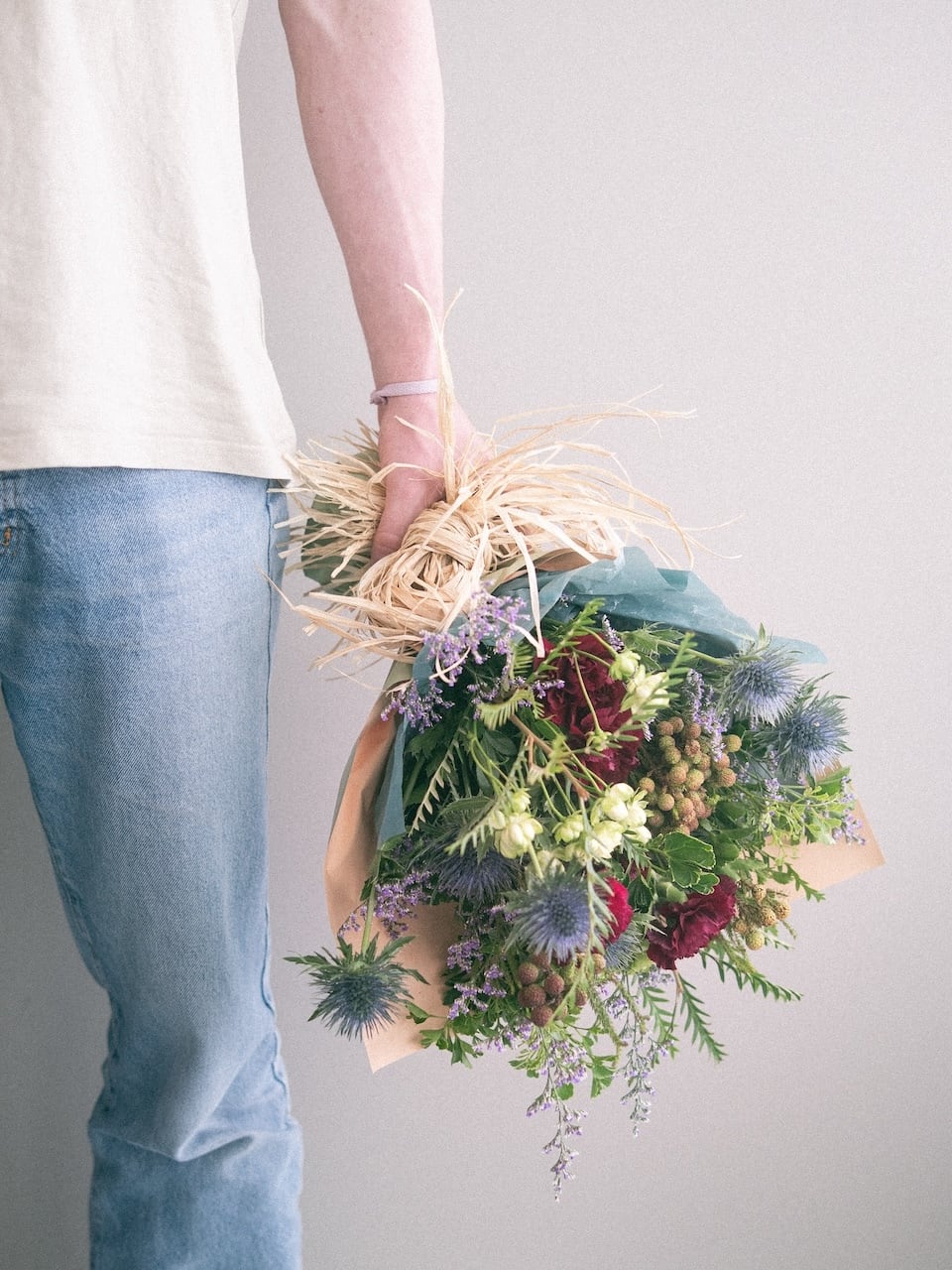 ボルドーのカーネーションと、シルバーブルーのエリンジウムがメインの花束です。