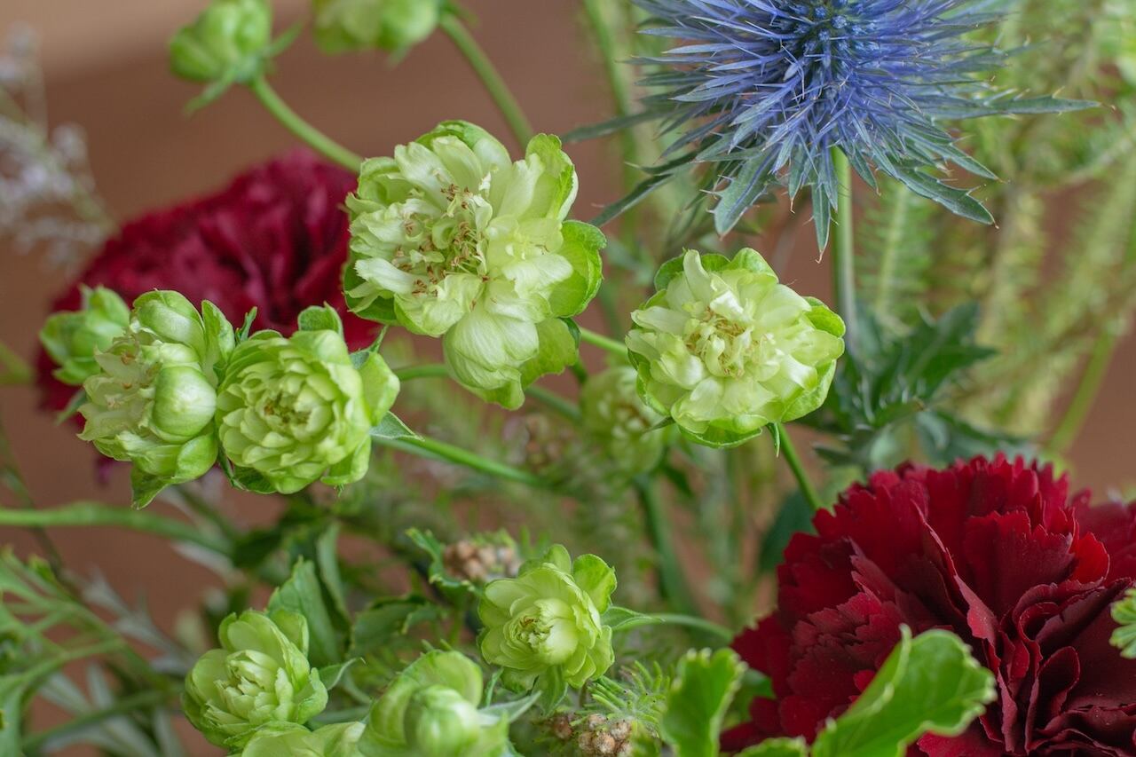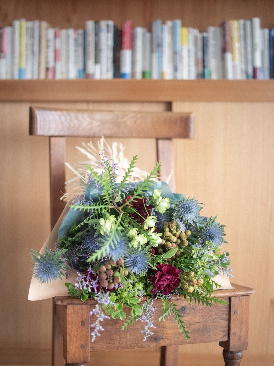 ボルドーのカーネーションと、シルバーブルーのエリンジウムがメインの花束です。