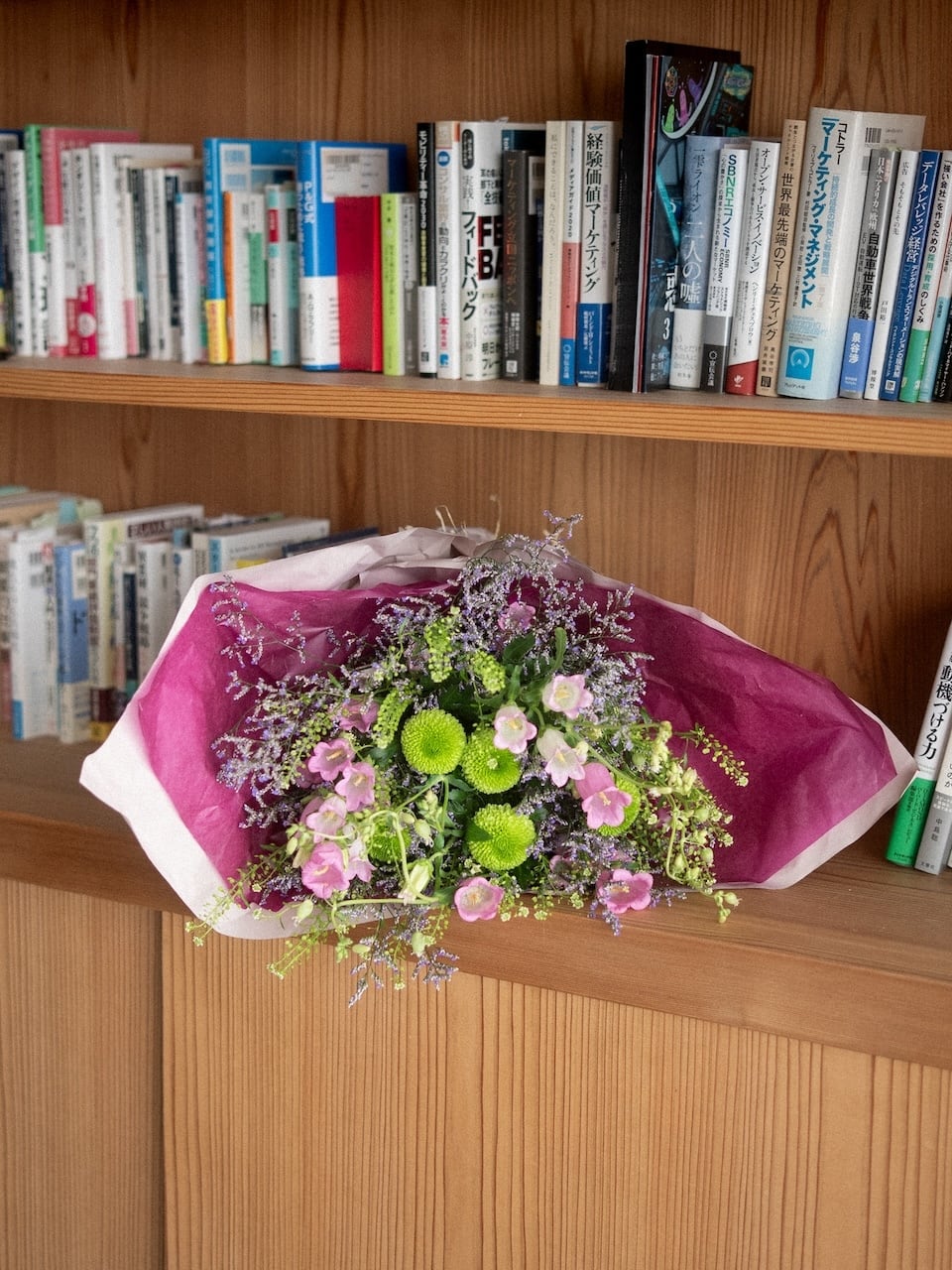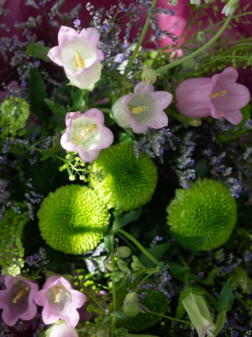 ピンク色のカンパニュラがやわらかな色合いで華やかさを演出し、ポンポンマムのふんわりとした丸い形が、ほっとする温かみを感じさせます。